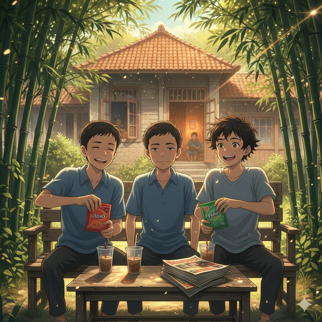 Akhirnya mereka duduk juga di bawah pohon bambu depan rumah gue — spot sakral tempat ngobrol, bengong, dan dengar suara daun gesekan angin.