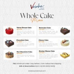 Jangan lewatkan kesempatan untuk menikmati sajian whole cake spesial ini. Hanya di Vasaka Hotel Jakarta. Untuk pemesanan dan informasi lebih lanjut, silakan hubungi Rani : +62 812-8032-5605.
