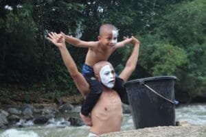 Dalam kesedihan, sosok terkubur berhasil di keluarkan, di bersihkan dari sampah yang menempel. Dan di mandikan dengan air suci dari sungai Ciliwung. Proses membersihkan diri ini tampak menjadi dramatis. Karena memang sulit sekali membasuk kekotoran, kekeruhan yang telah bertumpuk di tubuh sosok lusuh tersebut. Hal ini menggambarkan betapa sulit kerja-kerja menjadikan sungai dan lingkungan kembali bersih kembali suci alami. Meski berat tapi semua ini harus di kerjakan demi mewujudkan hidup yang lebih baik bersama alam dan sesama hidup.